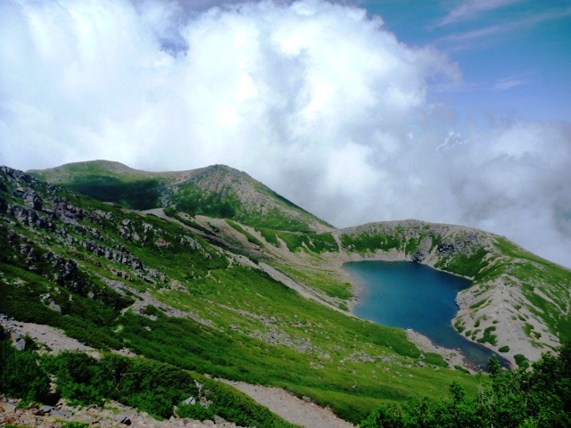 四ノ池から三ノ池へ。ここは水深13.3mと、日本で最も深い高山湖。三ノ池乗越からは、今しがた歩いてきた縦走路が一望でき、その光景に胸が満たされた。