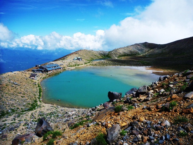 その後、一ノ池の外輪山をお鉢巡りし、標高2,905mに位置する二ノ池へと到達。ここは日本最高所の湖であり、木曽川の源流でもある。エメラルドグリーンの湖面と、青い屋根の山小屋(二ノ池本館)の対比が美しかった。