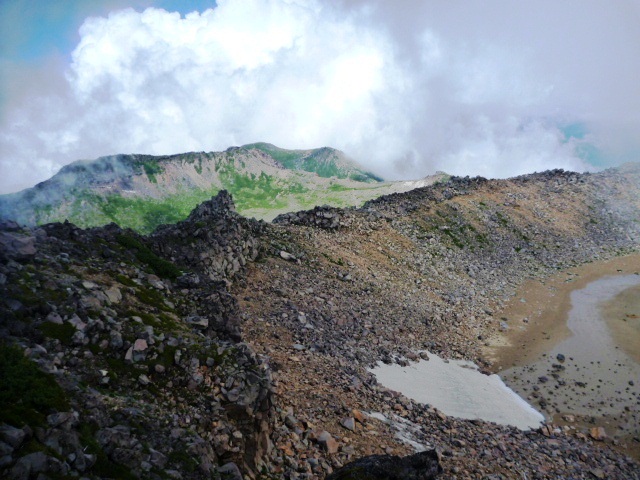 二ノ池からは賽の河原を経て、摩利支天山(2,959m)へ登る。ここでは、立ち上る雲と太陽が織りなす雄大な空の表情を堪能できた。心地よい風に吹かれ、時間を忘れるひとときであった。