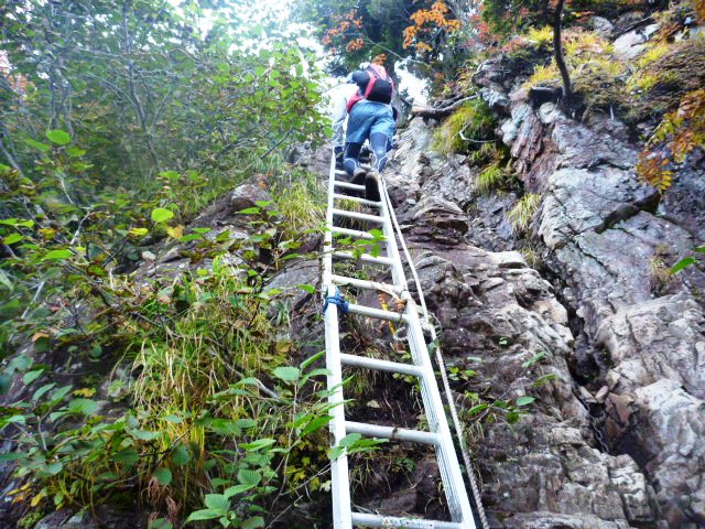 途中で水が足りなくなり、沢水をボトルに補給する。足元はびしょ濡れになりながらも、1km続く沢を這うように登りきる。その後はロープと梯子を使っての急登。正直、心身ともに限界が近づいていた。