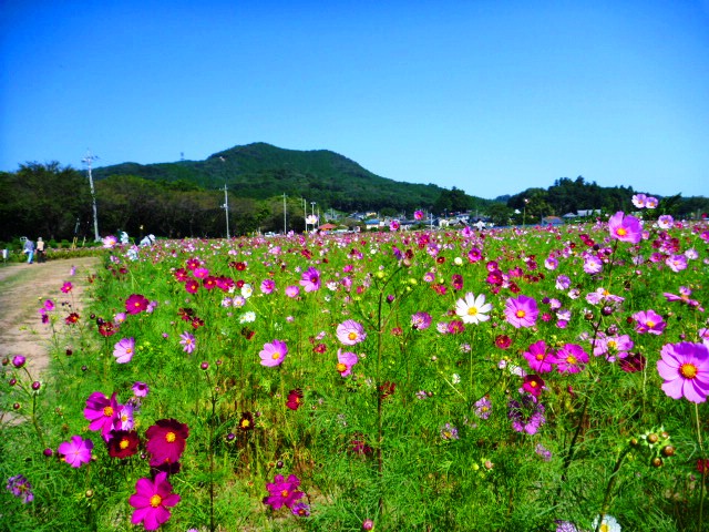 この時期、巾着田では曼珠沙華だけでなく、コスモスも一面に咲き誇っていた。淡いピンクや白の花が風に揺れる姿もまた見事で、赤一色の曼珠沙華と対比して季節の彩りを一層感じさせてくれる。