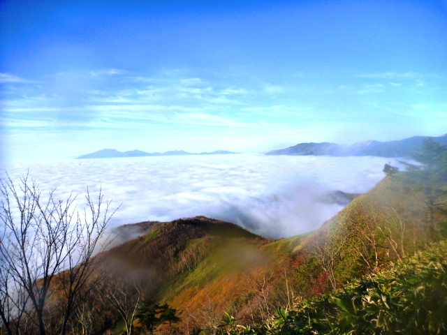 登り始めて徐々に高度を上げると、振り返る先に幻想的な雲海に浮かぶ山々が現れる。左手には浅間山、右手には草津白根山。思わず足が止まり、息を呑む絶景。