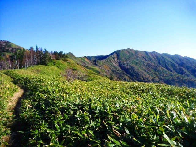 八間山を越え、開放的な笹原の稜線へ。トレイルは非常に歩きやすく、心地よい風の中を進む。もちろん、走れるところは軽快に走る。やがて、白砂山の堂々たる姿が前方に現れる。さすがは二百名山、存在感が違う。