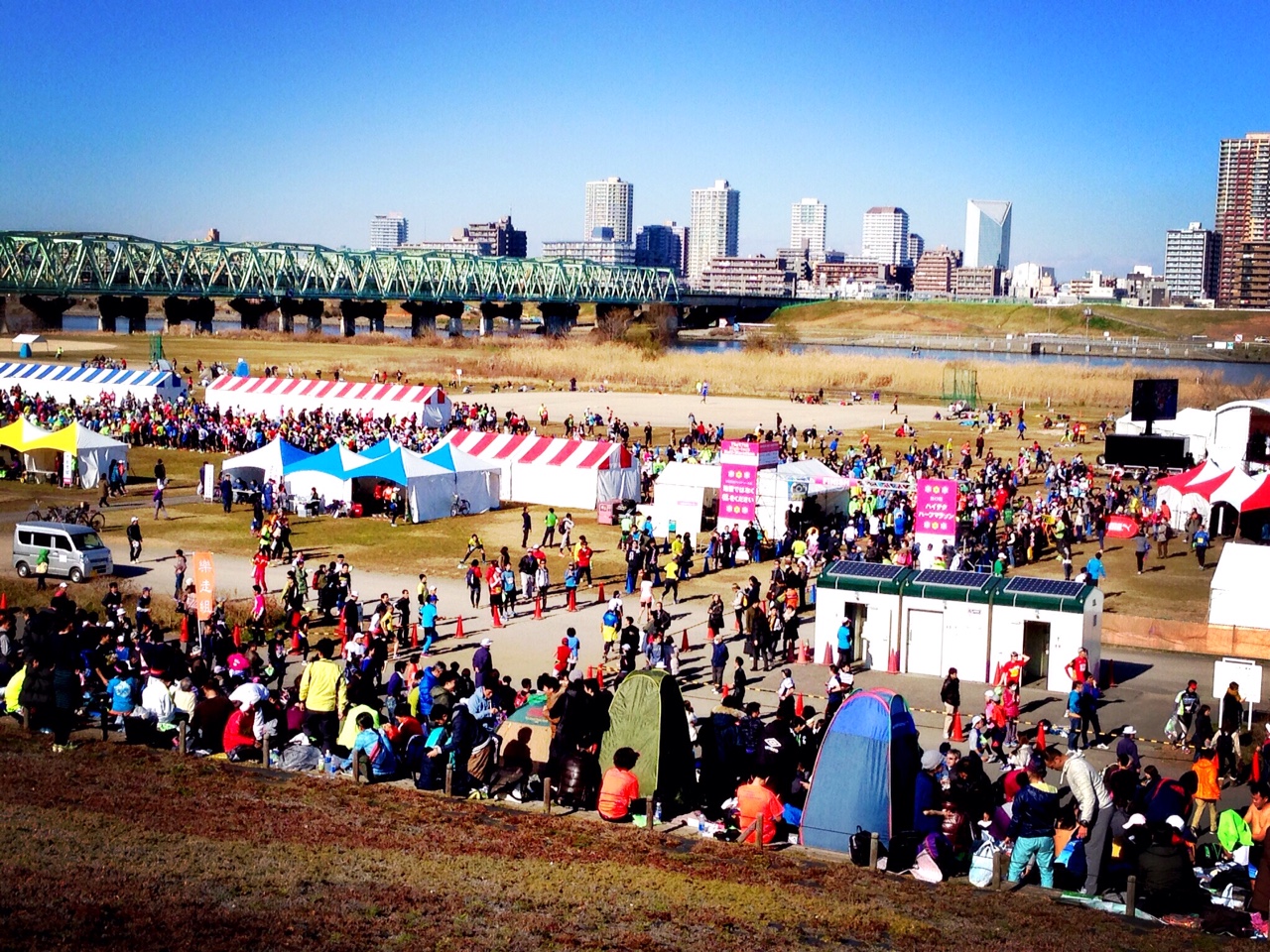 コースは日本陸連公認。荒川沿いのフラットな河川敷を使うため、記録が狙いやすい(かもしれない)。この日は晴天に恵まれ、風の影響も少なく、小春日和の絶好のコンディションであった。