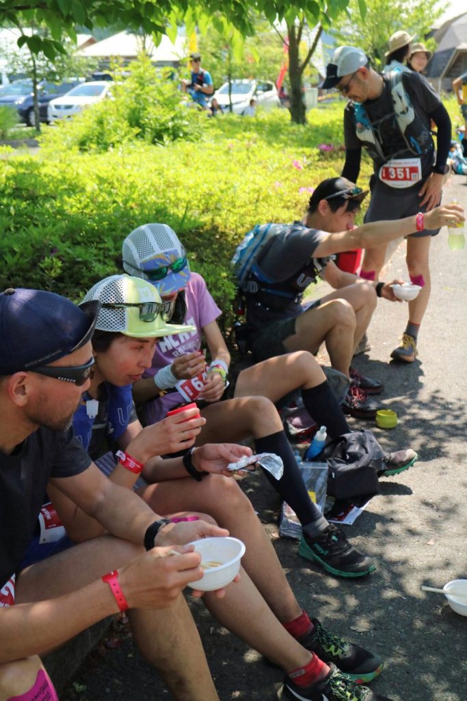 ここでも仲間のサポートを受け、エイドで蕎麦を口にする。食欲はなかったが、温かい汁をお湯で薄めて流し込んだ。差し入れのフルーツを頬張り、バナナはバッグへ。