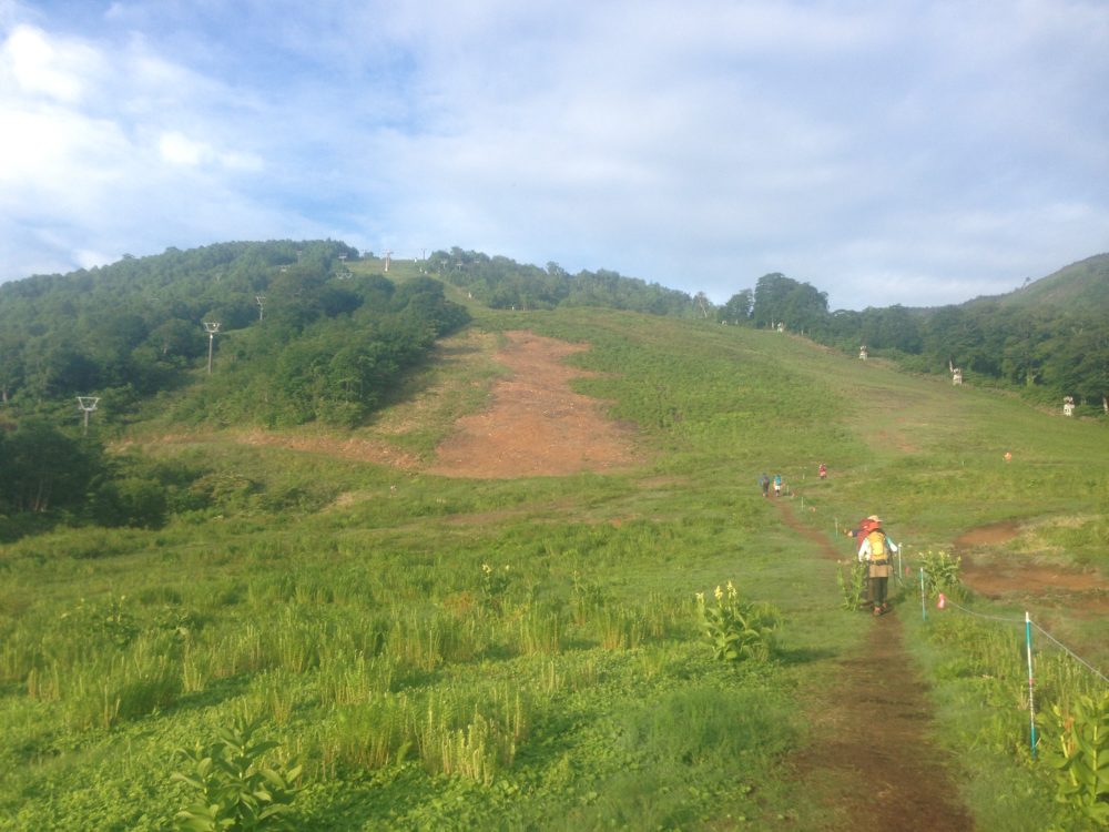 当日は越後湯沢駅に自家用車をデポ。タクシーを利用し、登山口の和田小屋(標高1370m)まで移動。所要時間30分、料金6000円。5時30分に山行を開始。最初のアプローチはスキー場のゲレンデで、手入れの行き届いた芝生のように一面刈り込まれており、やや人工的な印象を受けた。