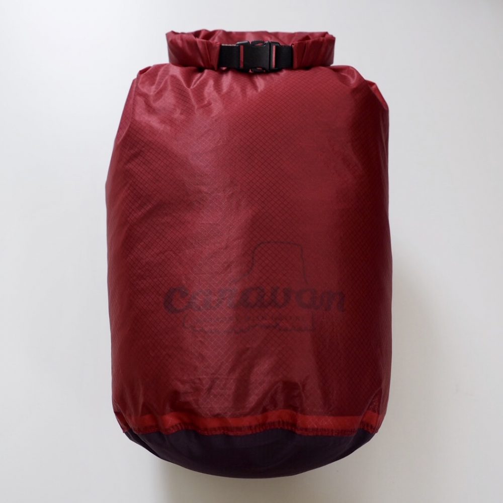 容量10Lの防水スタッフサックを使用している。バックパック内部の着替えや補給食を、汗や雨から守るためである。特にこのアイテムは、底面に防水かつ高通気性素材を用いており、ロールダウンするだけで中の空気が簡単に抜け、コンパクトに収納できる点が優れている。