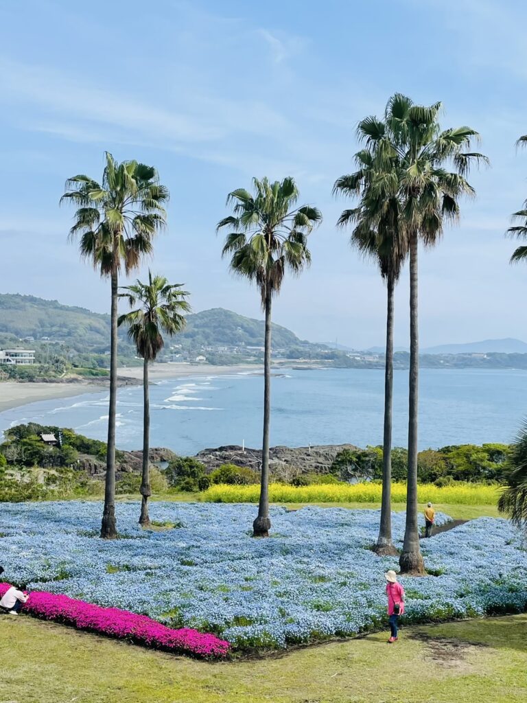「金ヶ浜ビュー園地」では、海と満開の花、そしてパームツリーが絶妙なバランスで調和。まるでリゾートのポストカードのような景色に癒された。