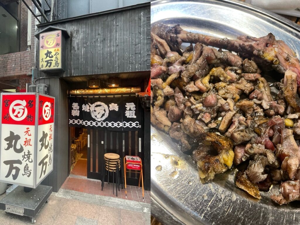 宮崎市に入り、夜は繁華街でご当地グルメを満喫。メインはもちろん、「地鶏の炭火焼き」。炭の香ばしさに、柚子胡椒の風味が抜群のアクセント。これはたまらない。