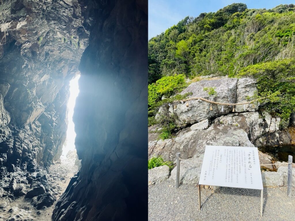 続いて訪れた「大御神社」は、海沿いの断崖に立つ美しい社。社殿の奥にある洞窟内の「龍宮」が見どころ。洞窟の最奥から振り返ると、光の加減と角度で浮かび上がる「昇り龍」のシルエットが。少しでも角度が変わると見えなくなるという神秘的な現象。その瞬間、時間が止まったようだった