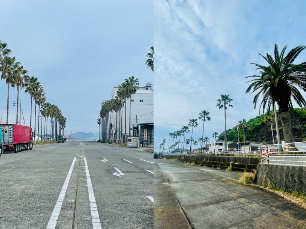 宮崎に入ると、街路樹や海岸沿いにパームツリーが並び、景色が一気に南国風に。空の青さとよく似合う。
