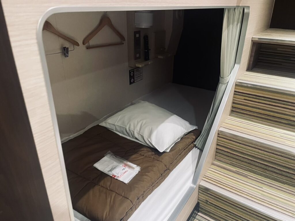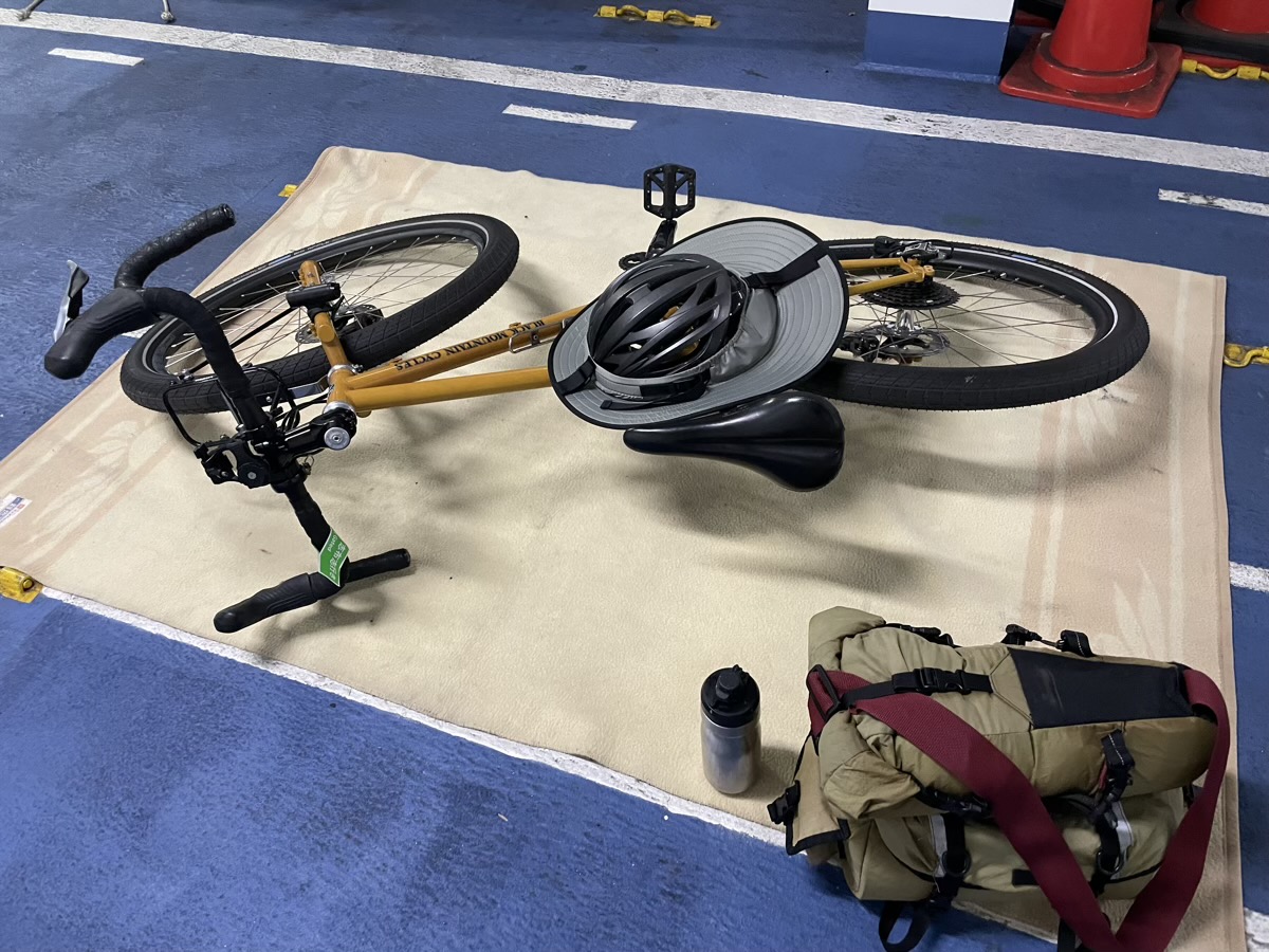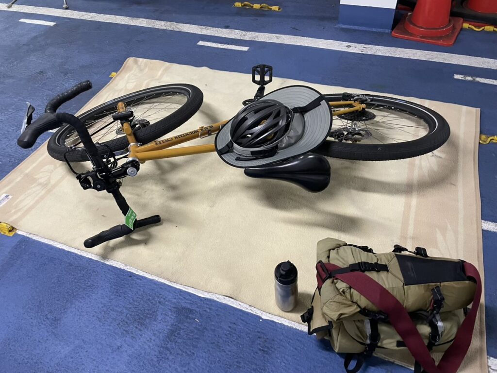 自転車は毛布を敷いた床に置かれ、船室はプライベートベッド。平日だからか、隣室も空いていて快適な時間を過ごせた。