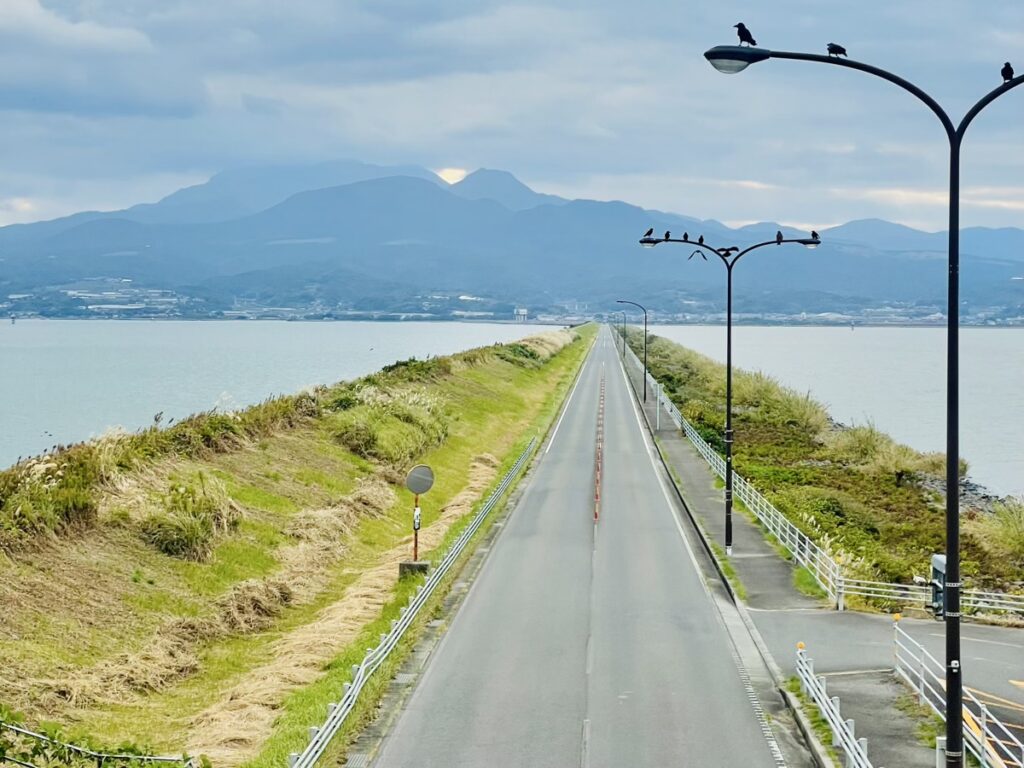 まずは雲仙多良シーラインへ向かった。諫早湾干拓堤防の上を、約8kmにわたって一直線に伸びるこの道路は、正面に雲仙岳を望みながら走ることができる。視界を遮るものはほとんどなく、海と空に包まれるような開放感があり、走っていて実に気持ちの良い区間であった。