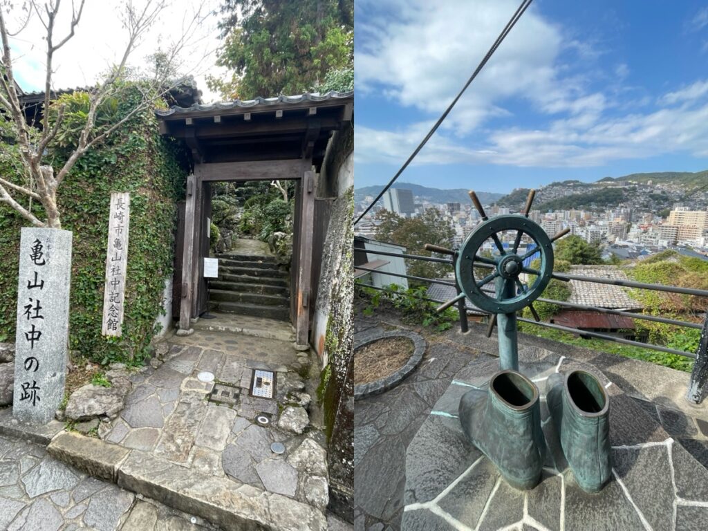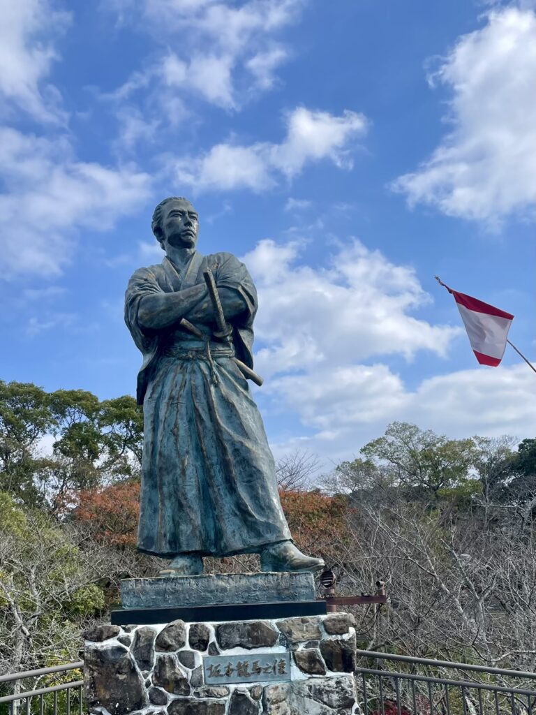 駐輪場所を探して自転車を置き、そこからは徒歩での観光となった。階段を何段も登り、亀山社中記念館、龍馬のぶーつ像、風頭公園展望台を巡り、最後に坂本龍馬像へと向かった。